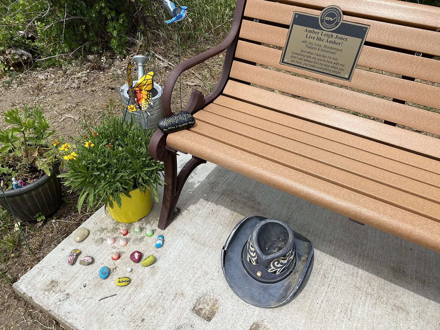I have prayed for Amber's parents on many occasions and I felt heavy for their loss. Often I have wondered about their story and how they were healing. Yesterday (4 months later) I once again felt God telling me to revisit the bench and place a little stone I painted with the URL of the post. I wandered to her spot and found that other folks had adorned the bench with plants, and glass angels, and other painted rocks to honor sweet Amber. I left my rock and prayed God would direct the right folks to find it.